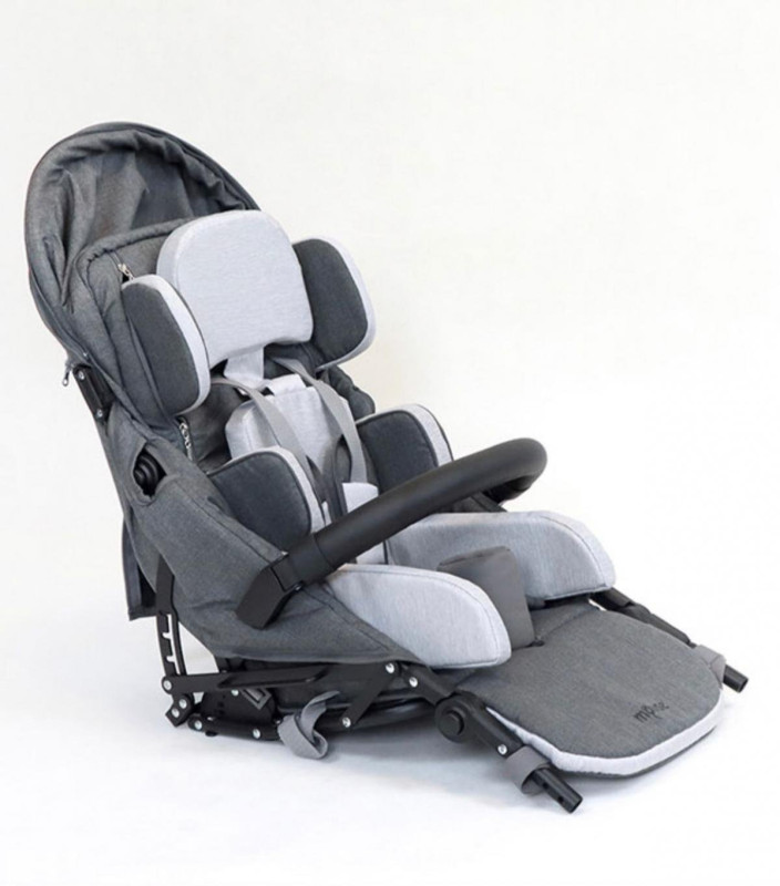 MOUSE dispone de una amplia gama de ajustes tanto del respaldo como del asiento y del reposapiés que permiten al niño obtener una posición óptima en la silla de paseo. También tiene la opción de colocar controles ajustables y un kit de ajuste del asiento (alcochados reductores) que hacen que viajar sea aún más seguro y cómodo para el pequeño usuario.